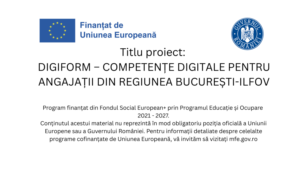 Regiunea București-Ilfov este hub-ul tehnologic al României, locul unde cele mai mari companii multinaționale își au sediile. Aici, standardele sunt mai ridicate decât oriunde altundeva în țară. Pentru a sprijini forța de muncă locală să atingă aceste standarde, proiectul DIGIFORM oferă un parcurs educațional structurat și accesibil. DIGIFORM – COMPETENTE DIGITALE PENTRU ANGAJATII DIN REGIUNEA BUCURESTI-ILFOV, proiect finantat din Fondul Social European+ prin programul Educatie si Ocupare 2021-2027 (COD PROIECT: 311837), a fost creat special pentru a răspunde nevoilor actuale ale pieței muncii, oferind soluții concrete de învățare pentru angajați.